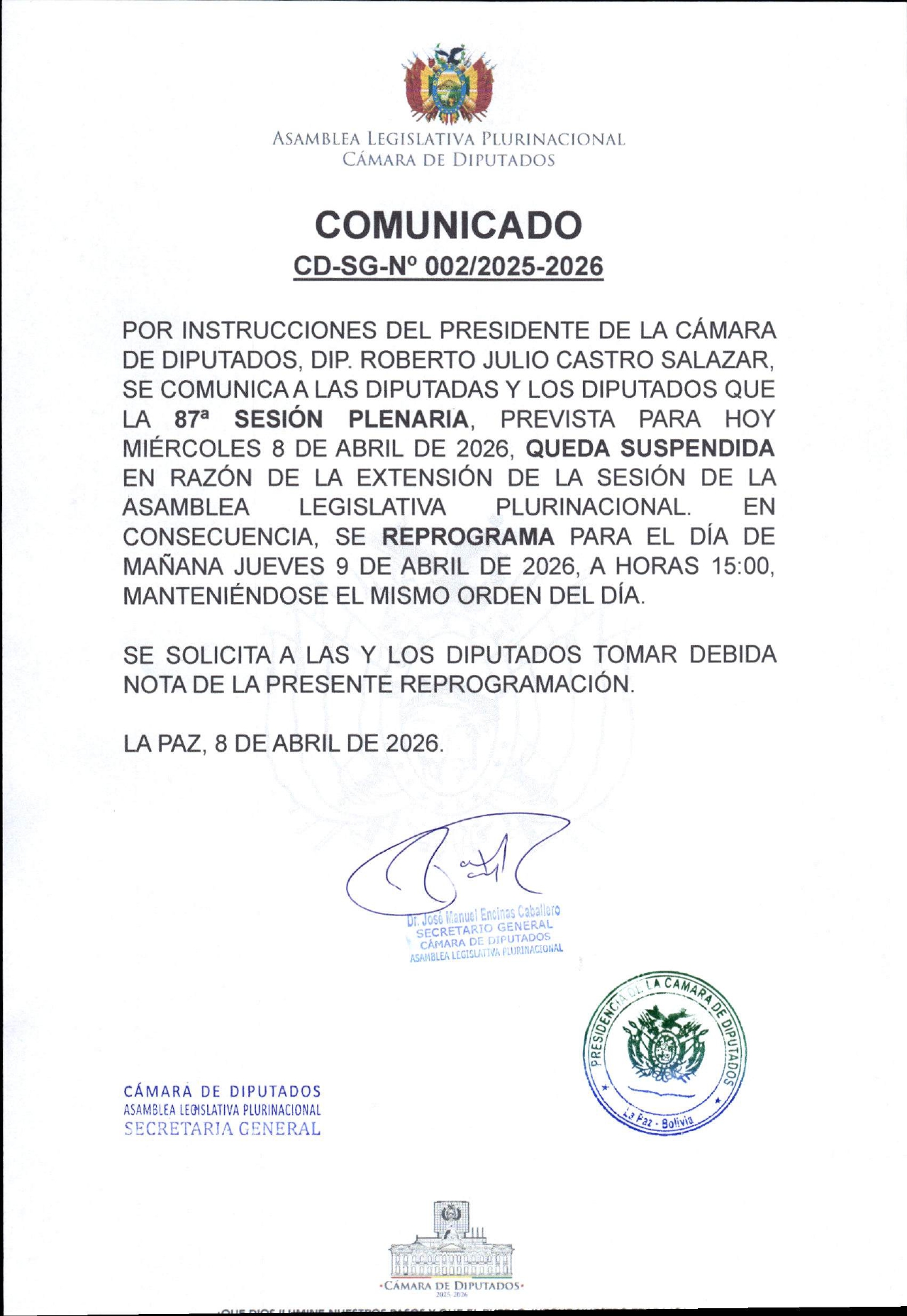 87ª SESIÓN ORDINARIA COMUNICADO + Añadir Google Calendar El evento está en curso. Fecha Abr 08 - 09 2026 En marcha... Categoría Sesiones Ordinarias
