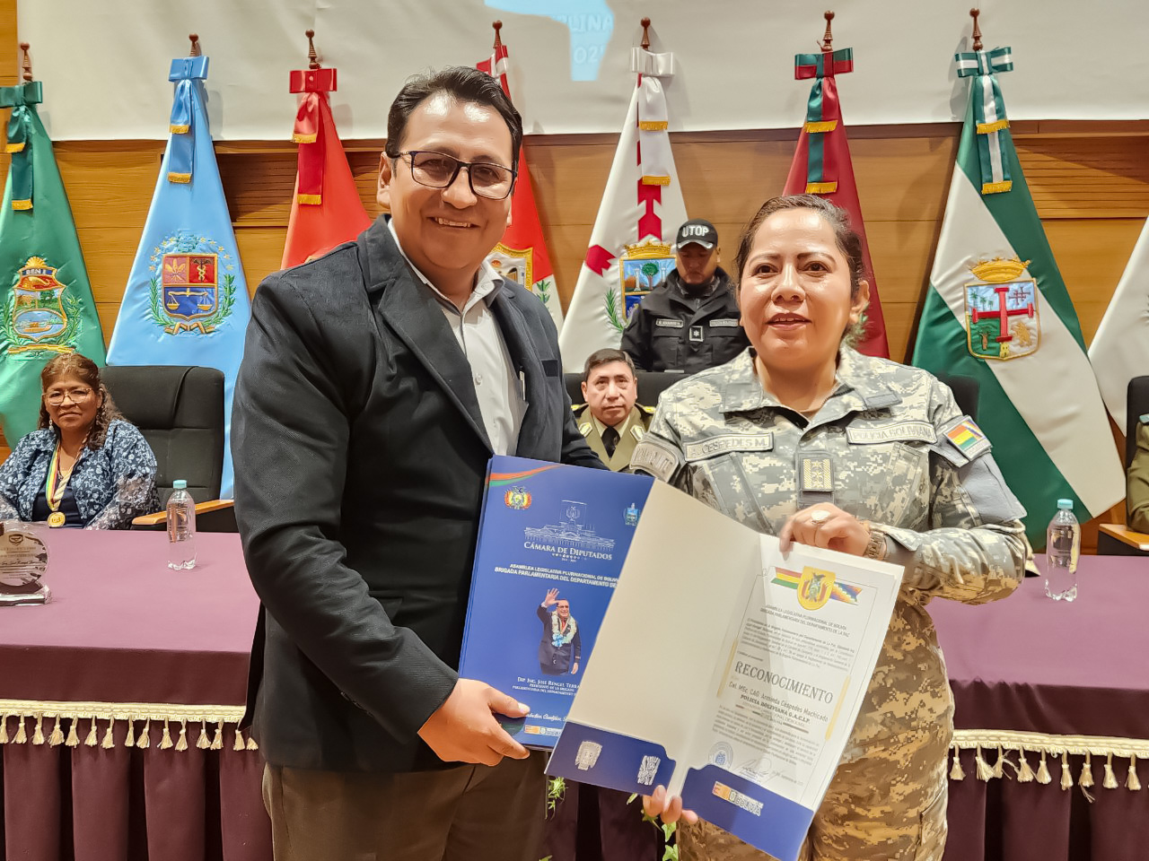 La Paz.- La Brigada Parlamentaria de La Paz participó este lunes en un acto especial para conmemorar el 27º aniversario del Grupo de Apoyo Civil a la Policía (GACIP), en ambientes de la Asamblea Legislativa, donde estuvieron presentes los diputados Zacarías Laura y Maribela Lipa (MAS-IPSP), quienes entregaron reconocimientos a esta institución por su destacada labor en tareas de prevención, auxilio y protección a la ciudadanía.